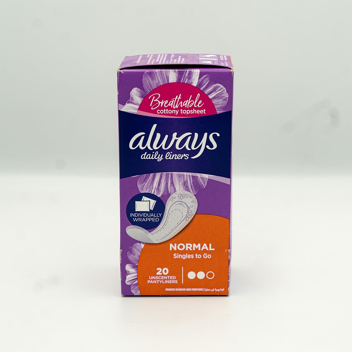 Always Daily Liners Normal are perfect for keeping you fresh and clean every day. Theyโ€™re soft, flexible, and so light youโ€™ll barely notice youโ€™re wearing them. Ideal for daily freshness or as backup protection, they move with you and stay in place. Each pack comes with 20 liners, ready to keep you feeling confident wherever you go.