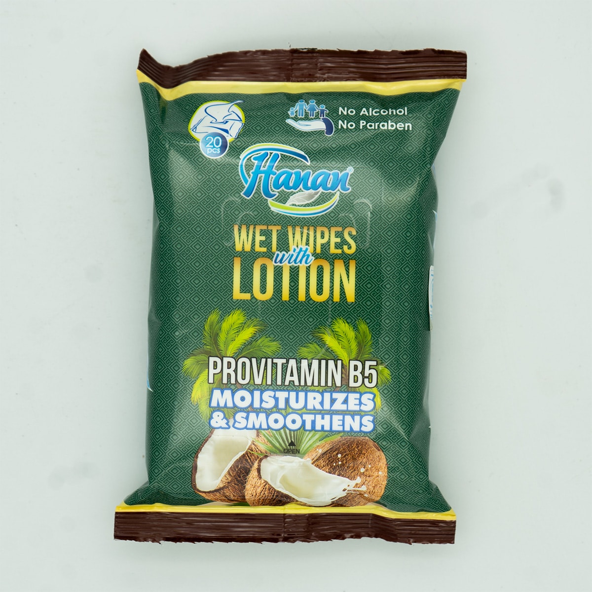 Hanan Wet Wipes with Lotion offer a gentle and effective way to cleanse and moisturize your skin on the go. Infused with Pro-Vitamin B5, these wipes help keep your skin soft, smooth, and healthy, making them ideal for daily use. Alcohol-free and dermatologically tested, they are suitable for all skin types, including sensitive skin. The convenient 20-piece pack is perfect for travel, handbags, or quick clean-ups at home.โ