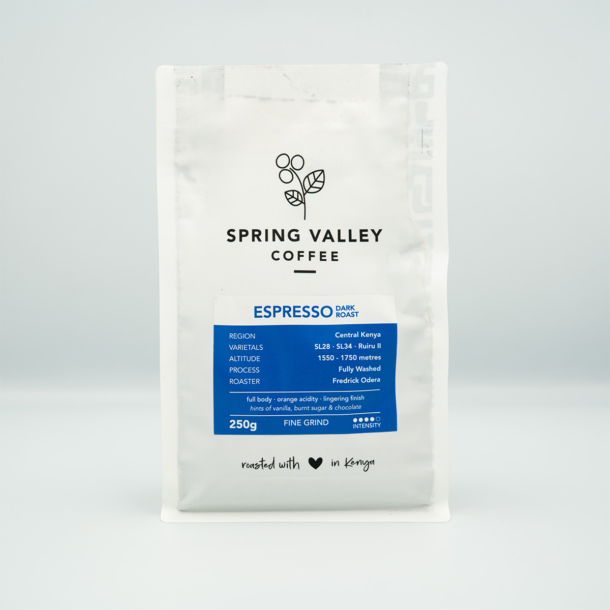 Spring Valley Coffee Espresso Dark Roast Fine Grindโฏ250โฏg is a full-bodied Kenyan masterpiece from Mt. Kenya. This dark roast, finely ground for espresso, mocha pot, or French press. Reveals notes of burnt sugar, vanilla malt, orange-tinged acidity, and bakerโs chocolate, finishing smooth and lingering. Hand-roasted in Nairobi since 2009, it offers bold tradition in every rich cup.